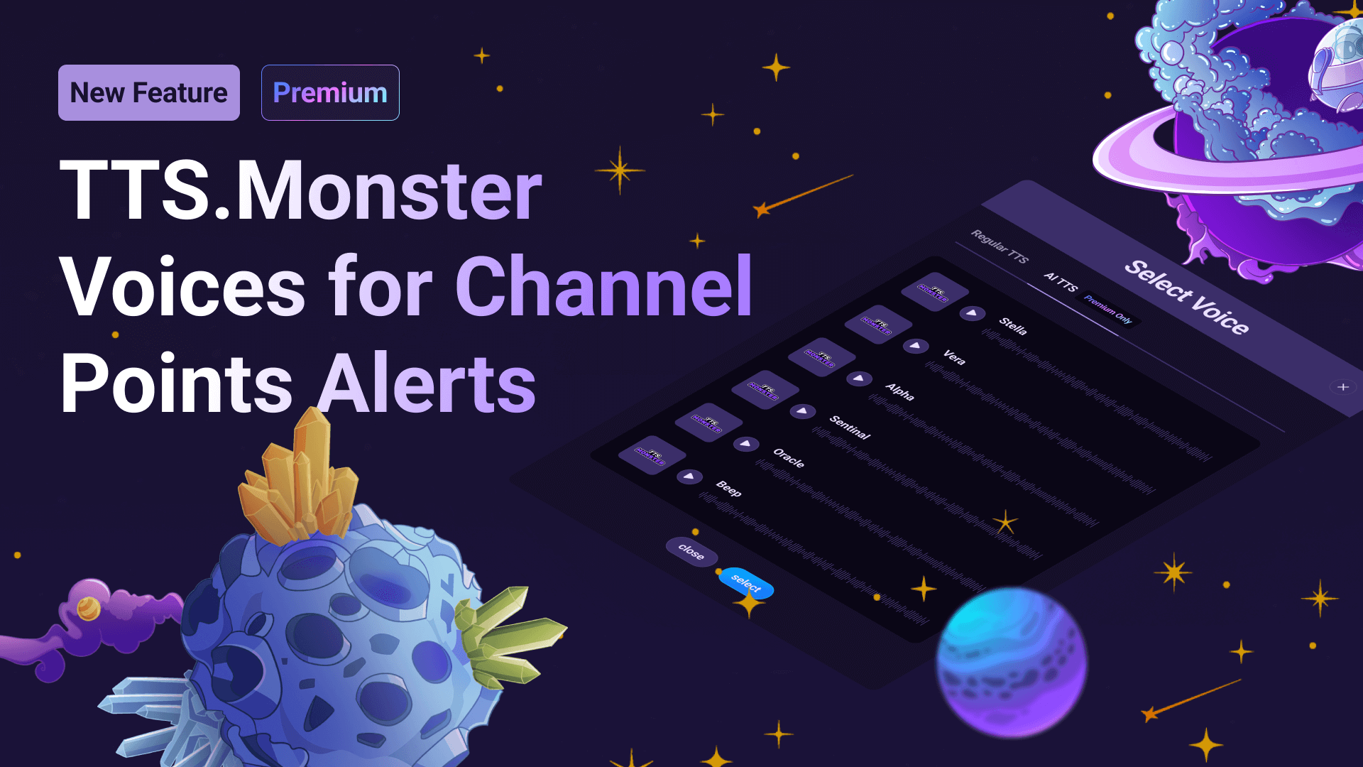 We just enabled our TTS.Monster voice catalog for Channel Points alerts. Sound Alerts Premium users can simply add them via the voice selection in the Channel Points tab and enable enhanced TTS capabilities for their stream. This update gives you access to 50+ new Text-to-Speech voices for any Channel Points alerts that add fun or surprising elements to your viewer messages.